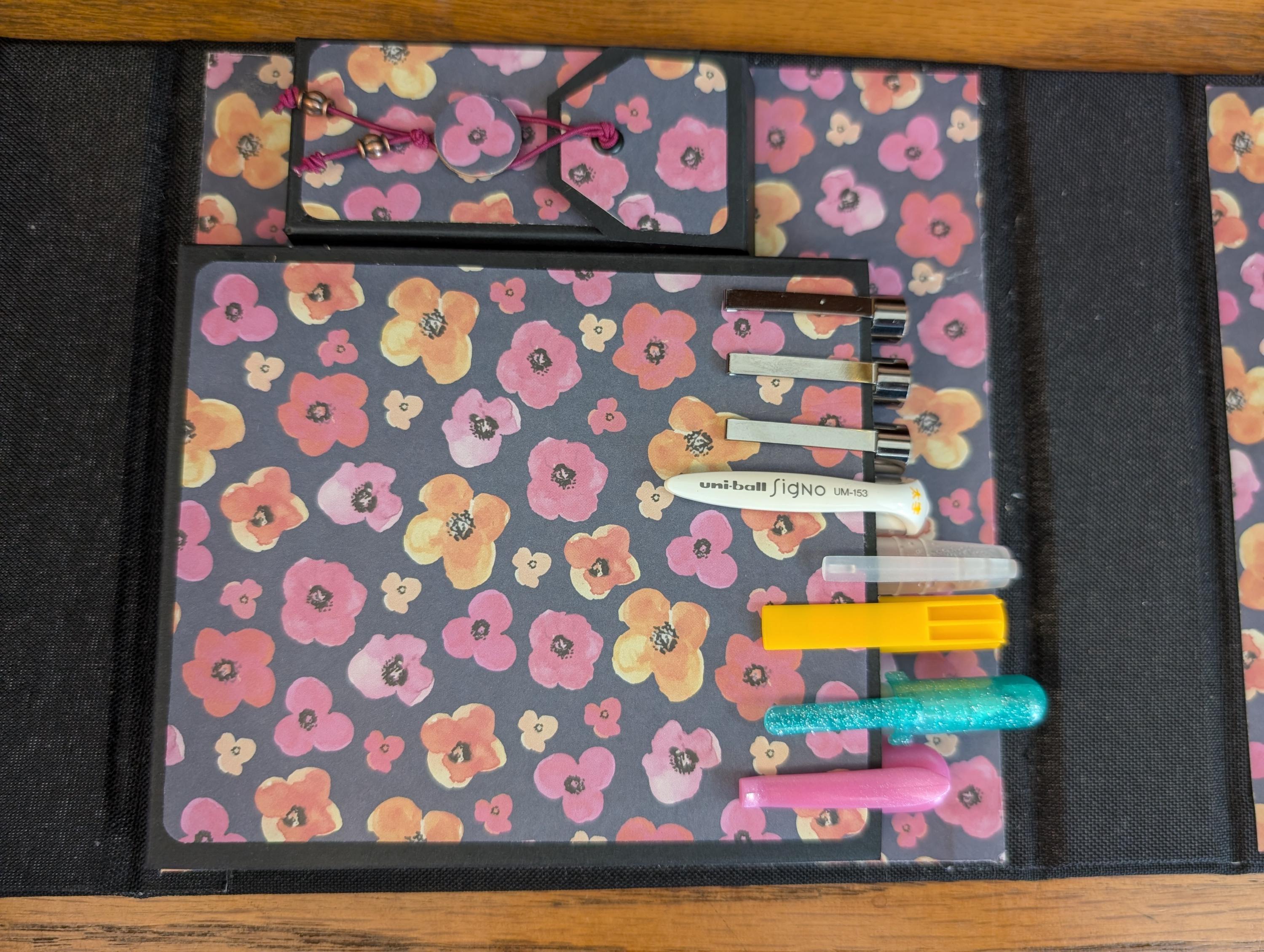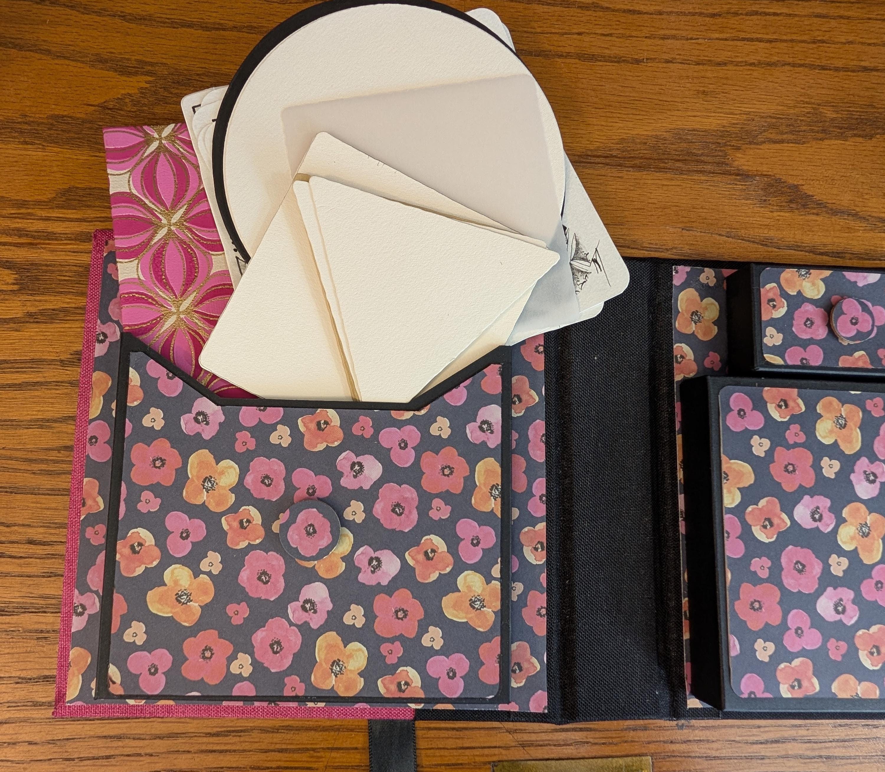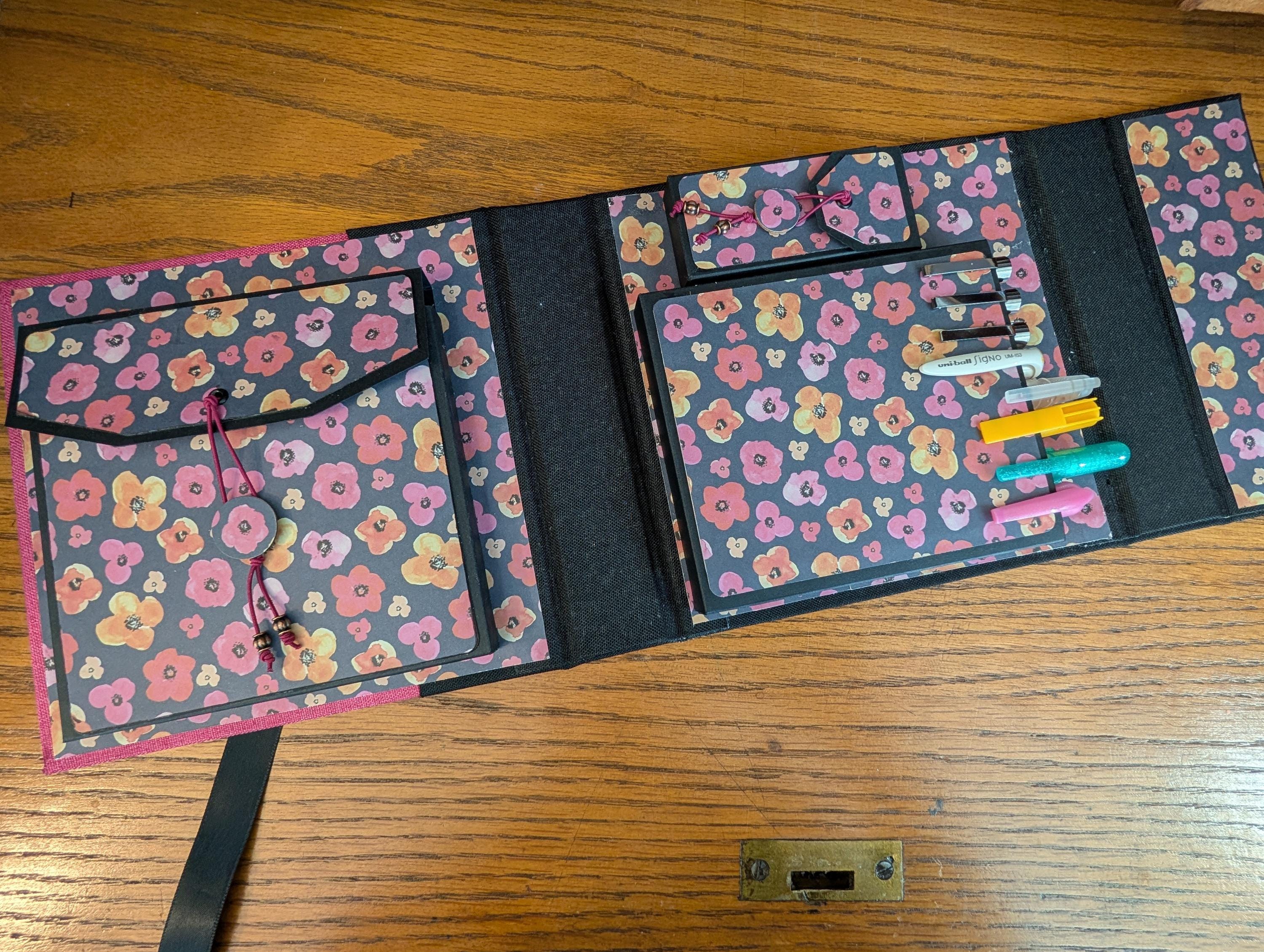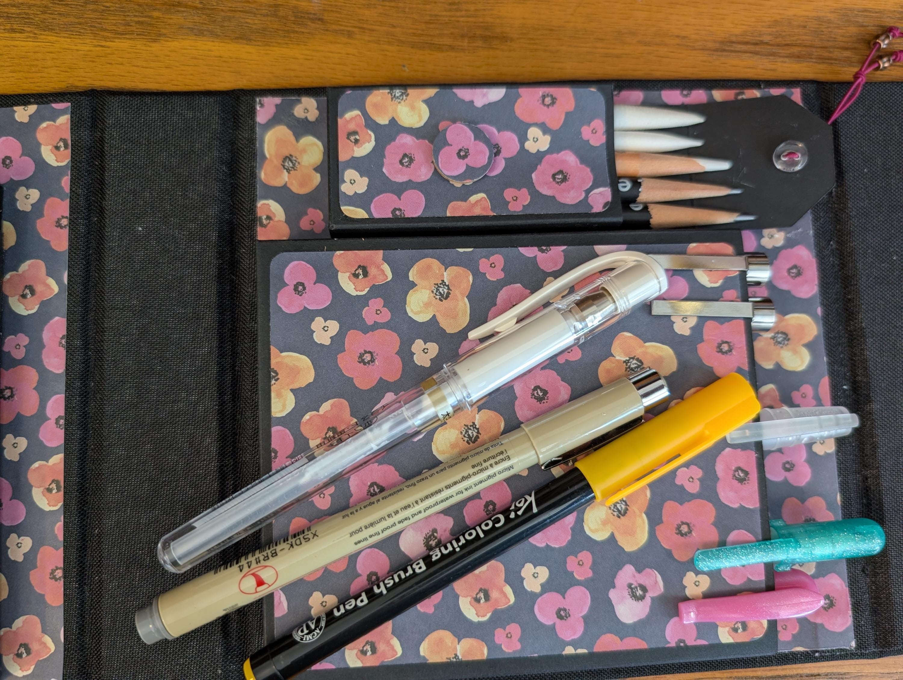 Interior Compartments (inches): Interior Compartments (inches): Drawing surface (Tiles or ZigZag Folio) compartment 5 x 5 x 1/2, Pen compartment (will hold a pen as long as nine inches) 5 x 4 3/4 x 1/2, and Pencil/Tortillon compartment 3 1/2 x 1 1/2 x 1/2