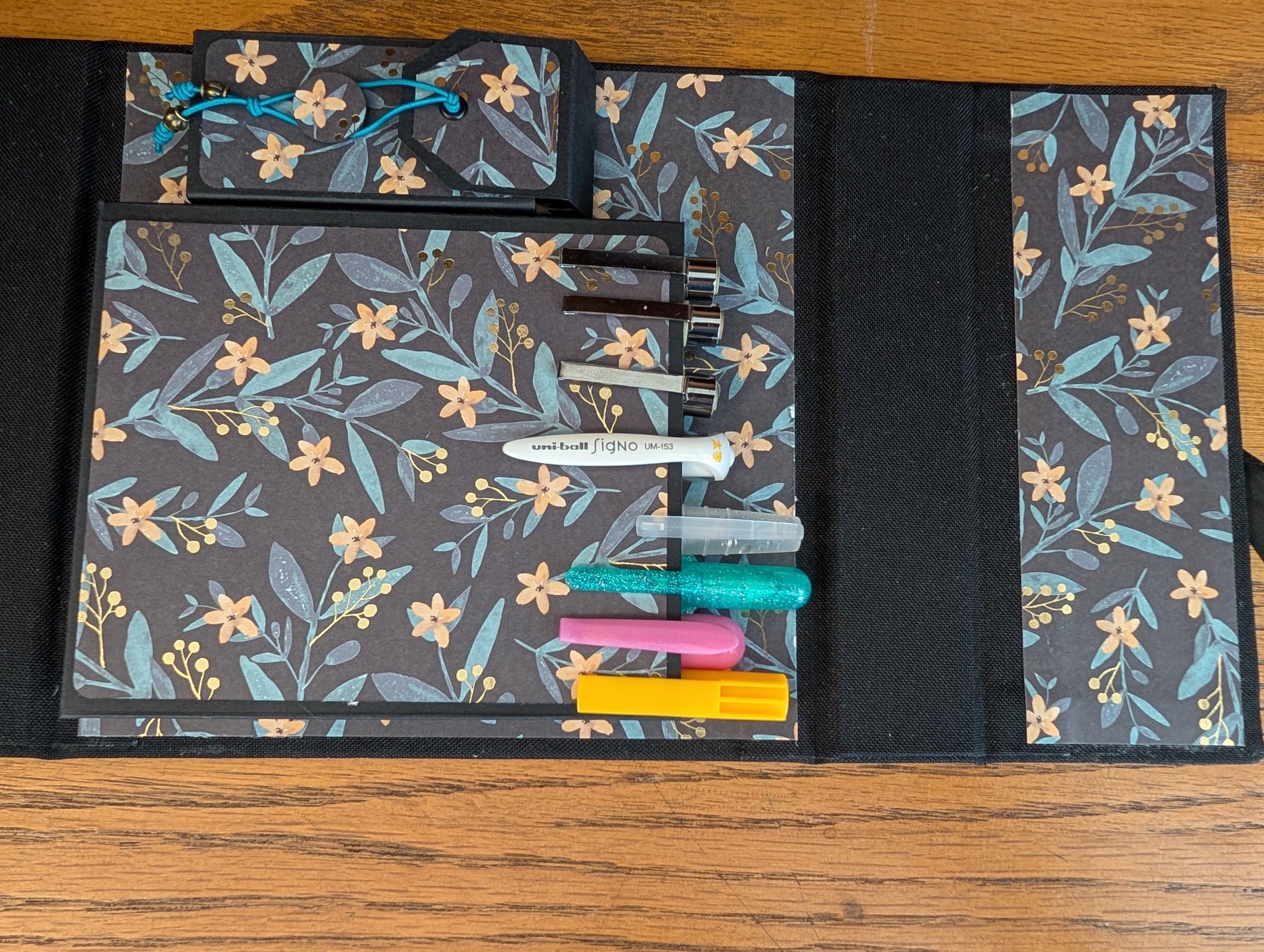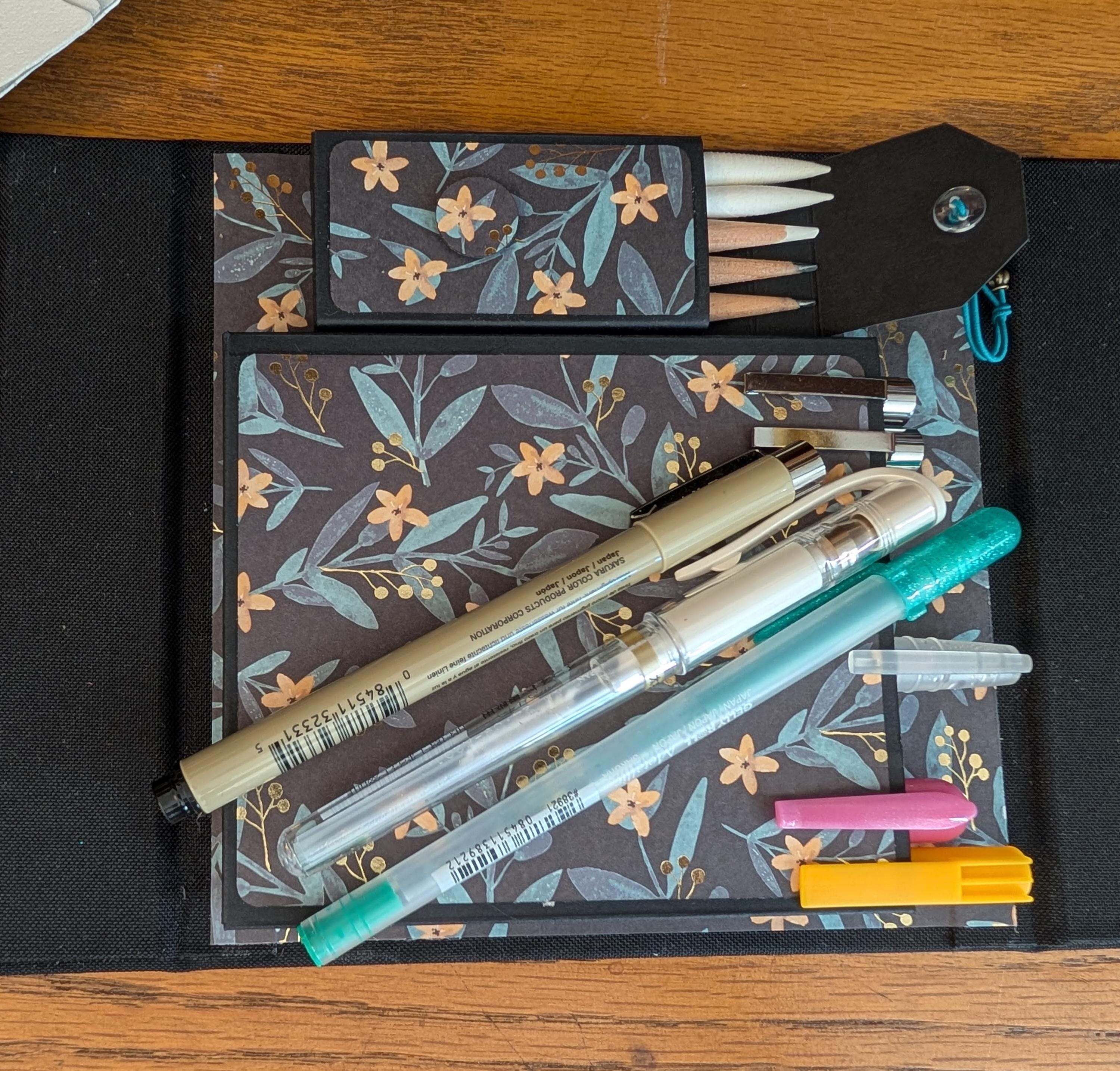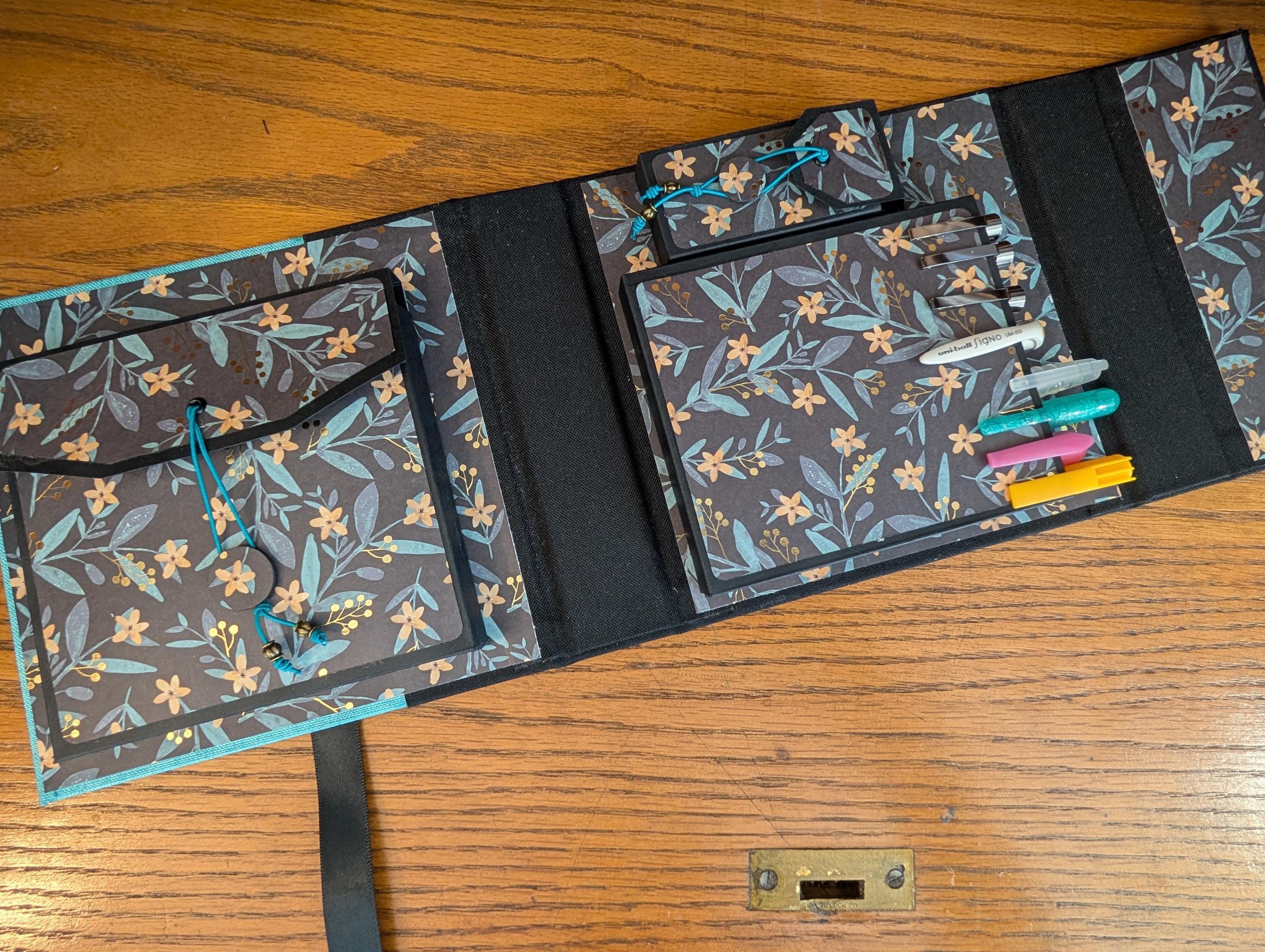 Interior Compartments (inches): Interior Compartments (inches): Drawing surface (Tiles or ZigZag Folio) compartment 5 x 5 x 1/2, Pen compartment (will hold a pen as long as nine inches) 5 x 4 3/4 x 1/2, and Pencil/Tortillon compartment 3 1/2 x 1 1/2 x 1/2