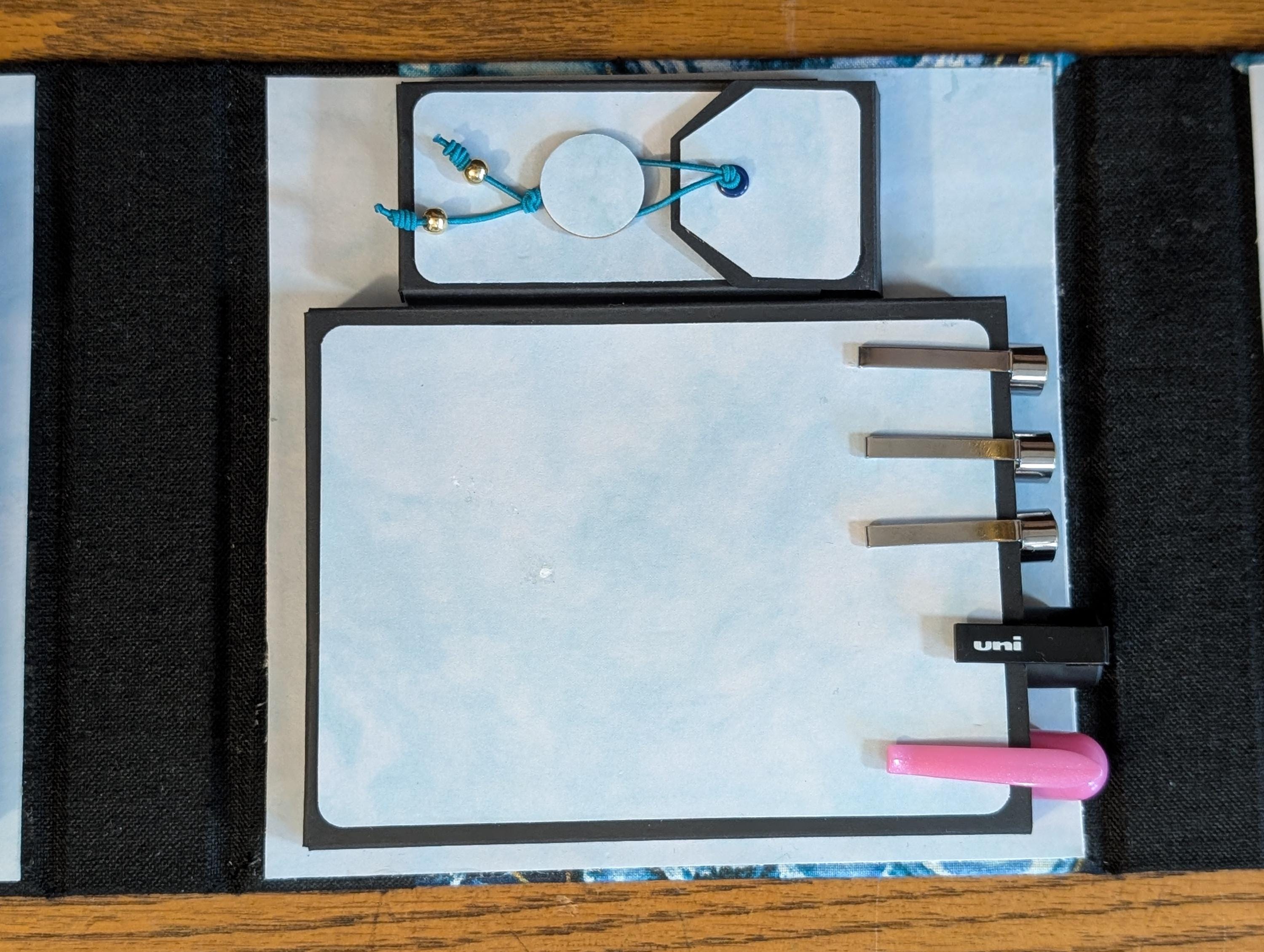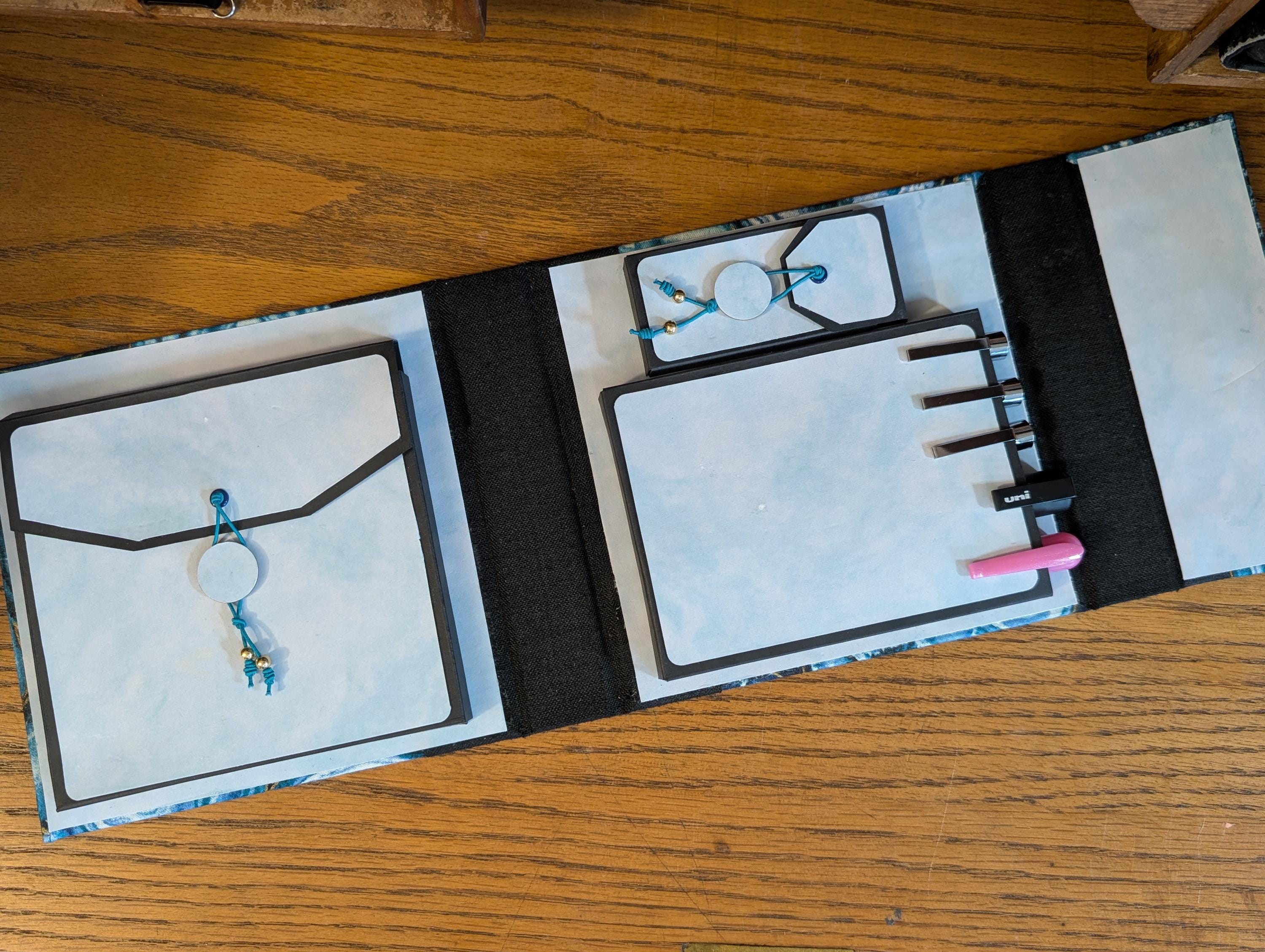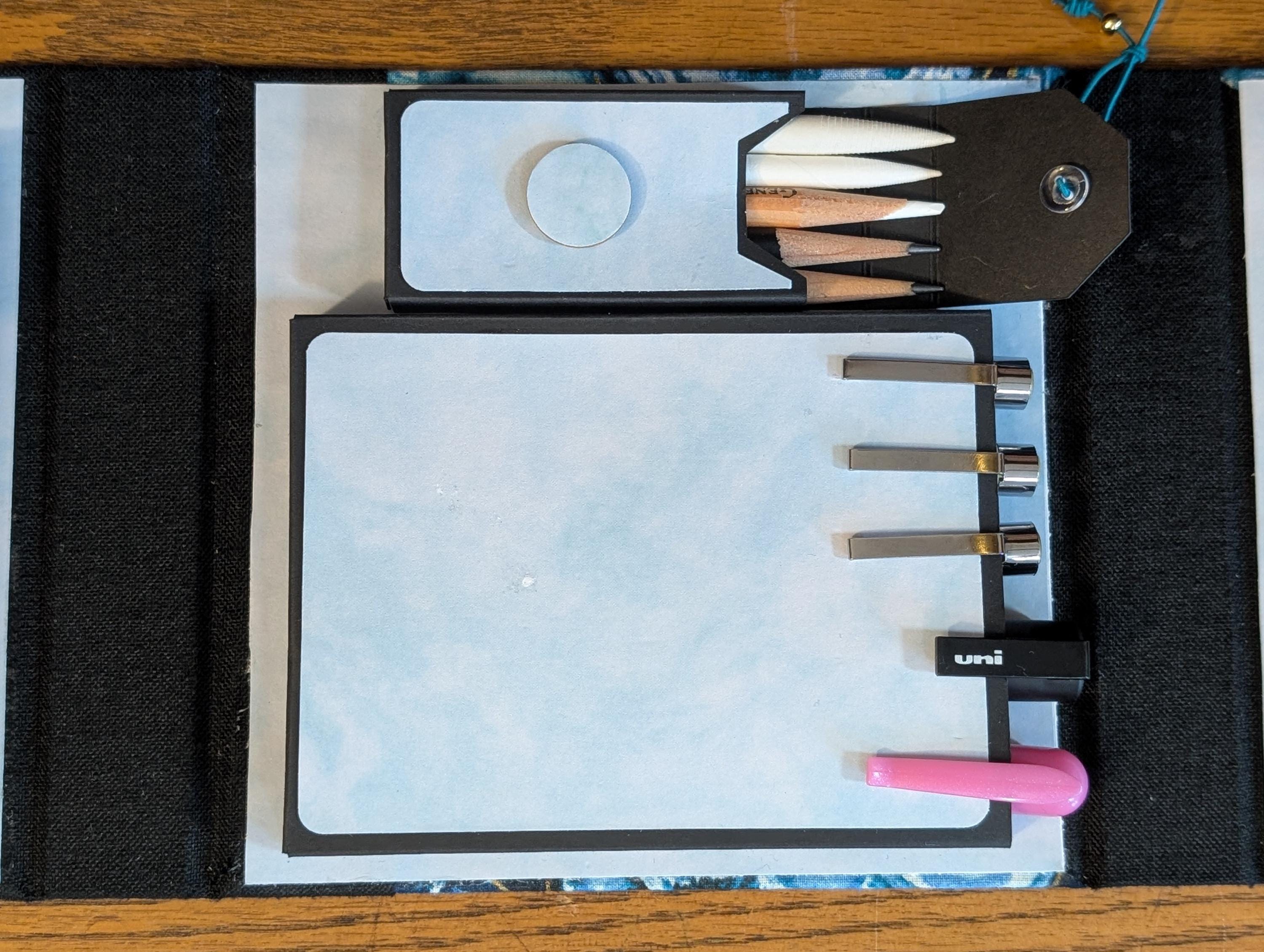 Interior Compartments (inches): Interior Compartments (inches): Drawing surface (Tiles or ZigZag Folio) compartment 5 x 5 x 1/2, Pen compartment (will hold pens as long as 5 1/2 inches) 5 x 4 3/4 x 1/2, and Pencil/Tortillon compartment 3 1/2 x 1 1/2 x 1/2