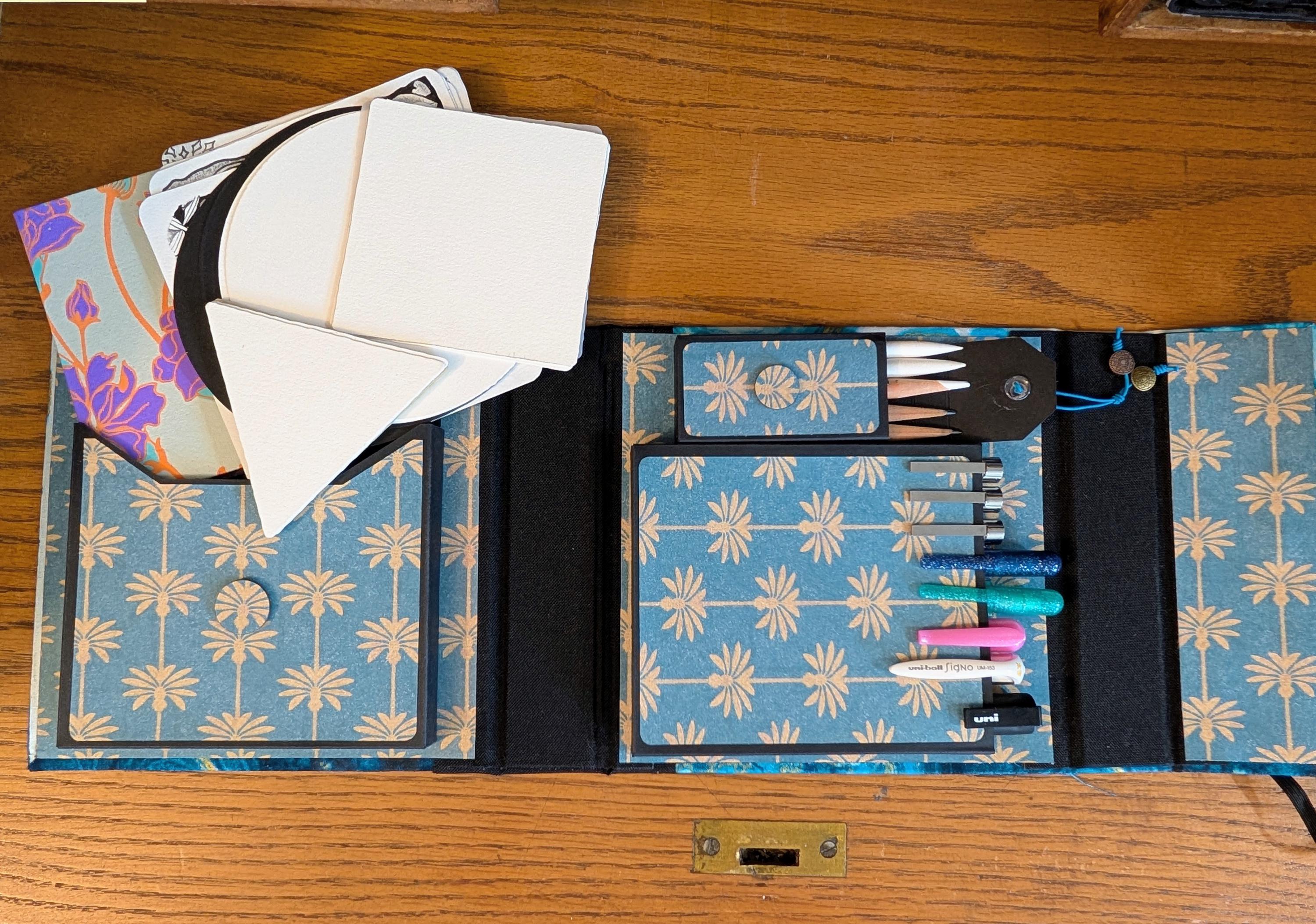 Interior Compartments (inches): Interior Compartments (inches): Drawing surface (Tiles or ZigZag Folio) compartment 5 x 5 x 1/2, Pen compartment (will hold pens as long as 6 inches) 4 1/4 x 5 x 1/2, and Pencil/Tortillon compartment 3 1/2 x 1 1/2 x 1/2