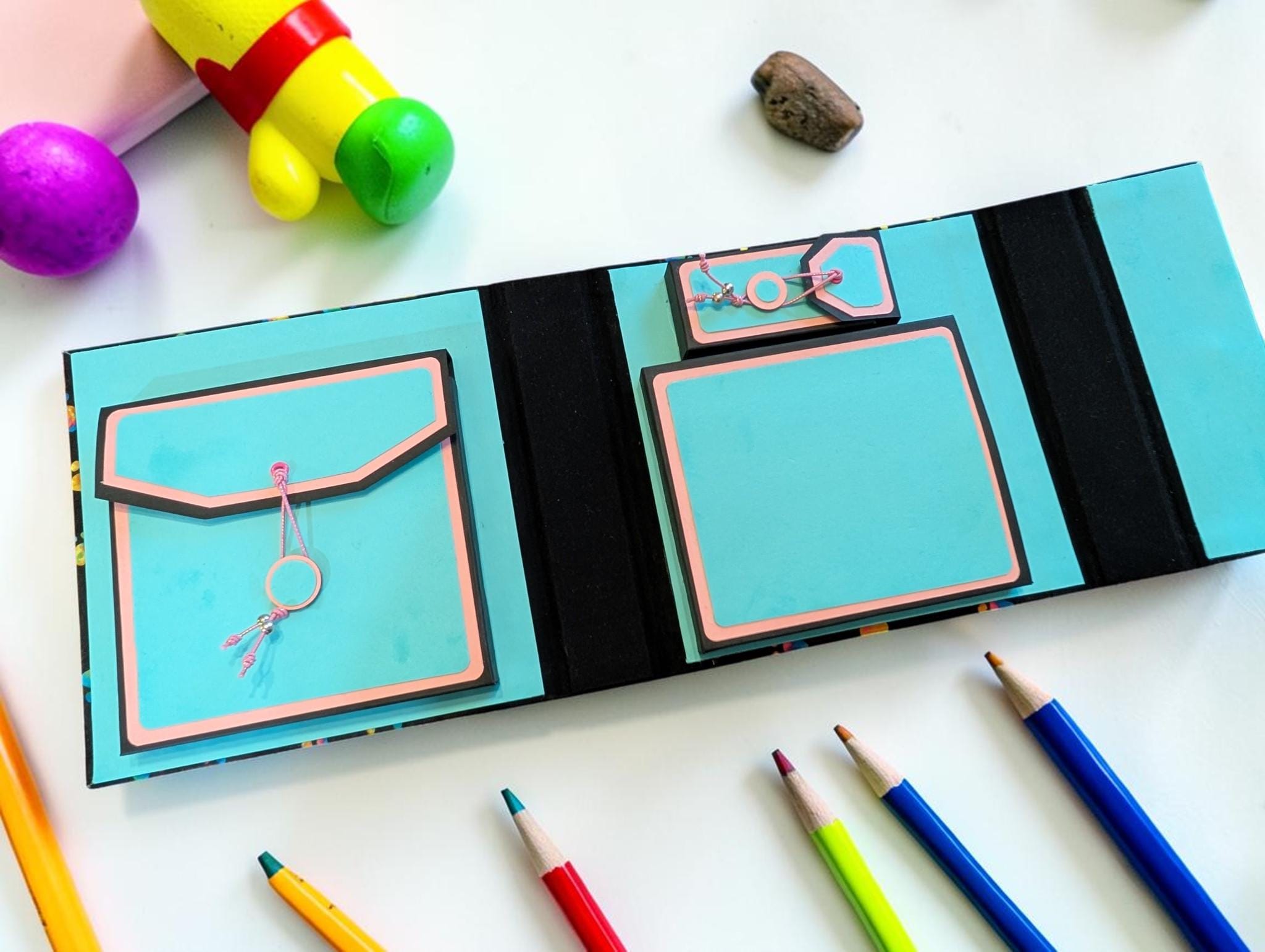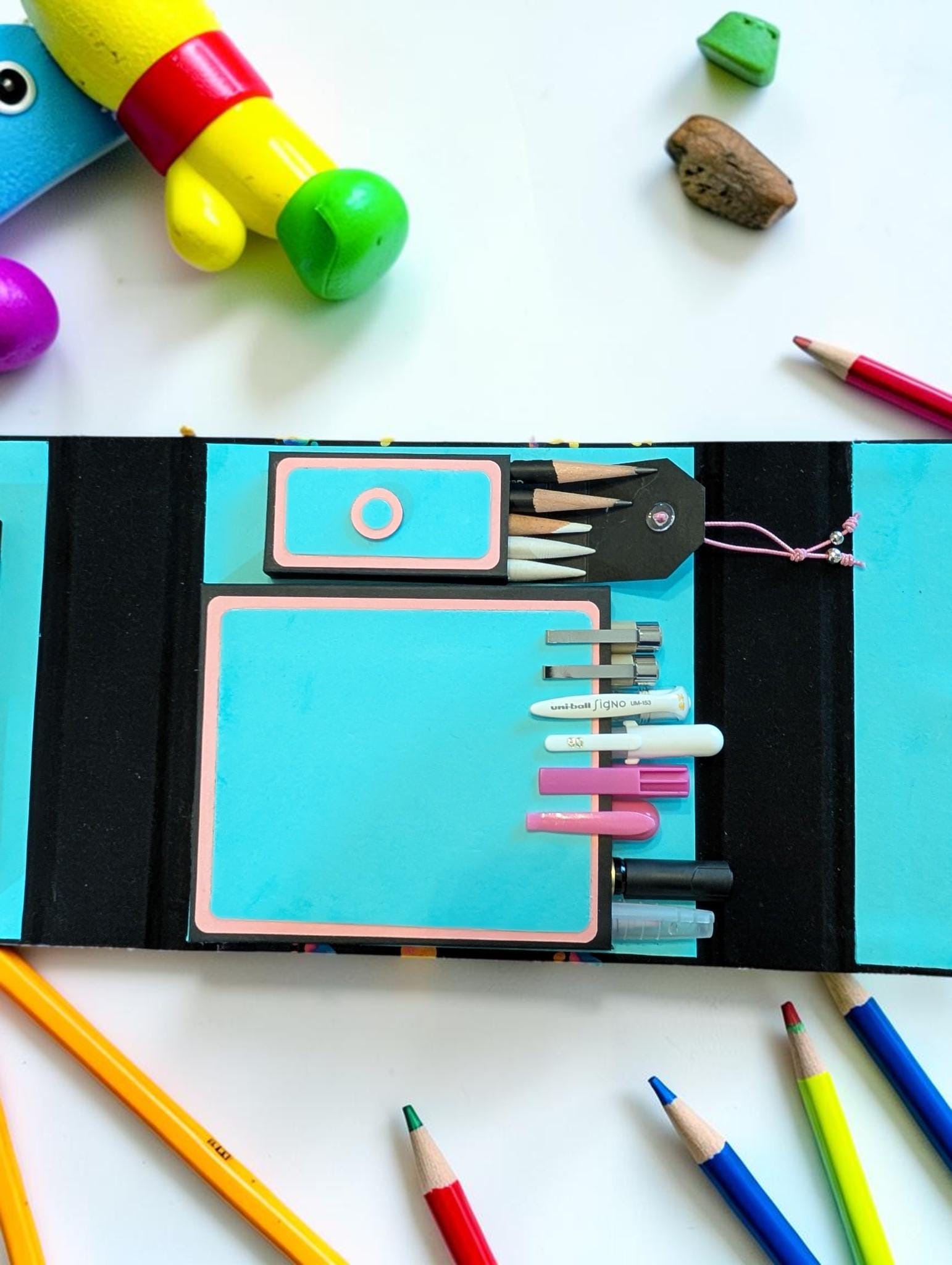 Interior Compartments (inches): Interior Compartments (inches): Drawing surface (Tiles or ZigZag Folio) compartment 5 x 5 x 1/2, Pen compartment (will hold pens as long as 6 inches) 4 1/4 x 5 x 1/2, and Pencil/Tortillon compartment 3 1/2 x 1 1/2 x 1/2