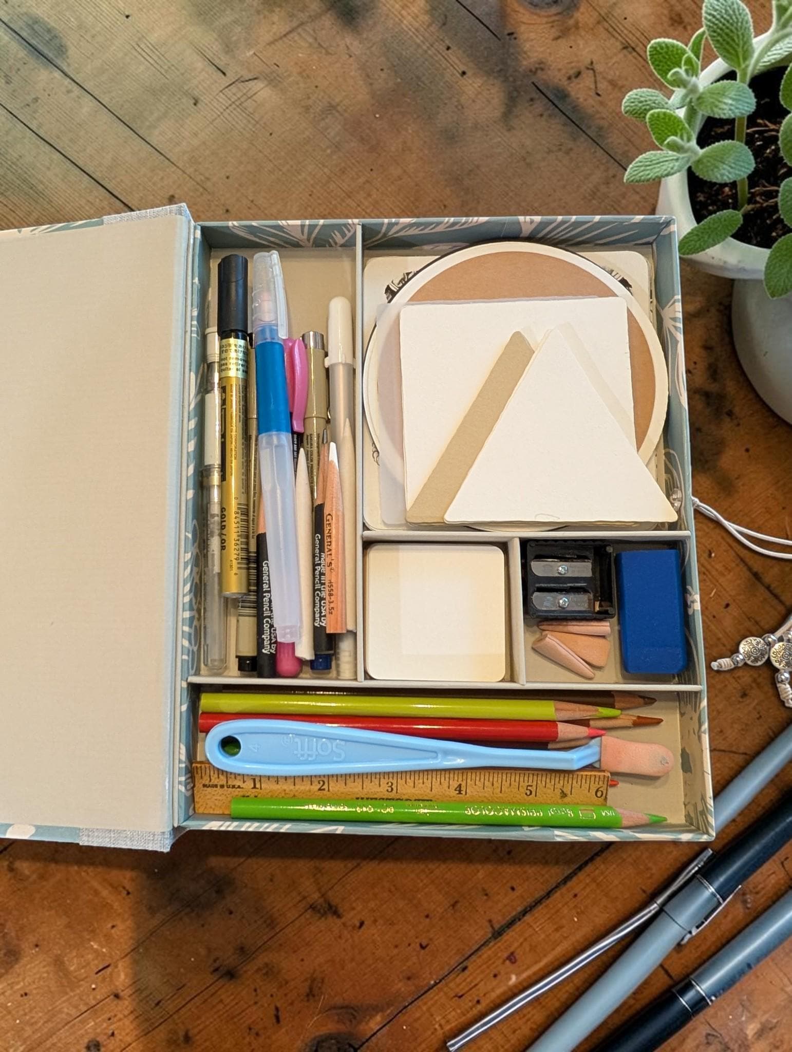Whether it’s tangling, sketching, doodling, or using color pencils, our all-new art box is crafted for artists who value convenience and organization! Imagine having all your favorite supplies—color pencils, gel pens, sharpeners, tortillons, drawing tiles, and more—neatly organized and ready for your next adventure. As an artist who likes to travel, I recognized the need for a convenient and organized way to carry my art supplies. These traveling art boxes are handmade, making each one unique and one of a kind. Thoughtfully designed with five compartments in various sizes, this art box is as compact as a book, making it effortless to slip into a large purse or carry-on bag. Now, you can take your creativity wherever you go.